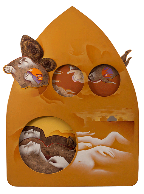 Acrílico, óleo, amate y plástico sobre cartón