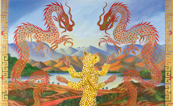En el óleo sobre tela Crisis asiática (1999), por ejemplo, una figura con cuerpo y cabeza de leopardo y manos y pies antropomorfos se encuentra arrodillada en medio de un camino rojo. Dos dragones suspendidos en el aire y de clara inspiración oriental secundan a la figura, la que se encuentra rodeada por un paisaje con abundante vegetación y montañas. A modo de decoración, en cada uno de los cuatro bordes de la tela hay grecas doradas con detalles rojos. De acuerdo con la artista, al momento de realizar esta obra estaba siguiendo las noticias sobre la crisis financiera asiática que afectó a la economía mundial entre 1997 y 1999.